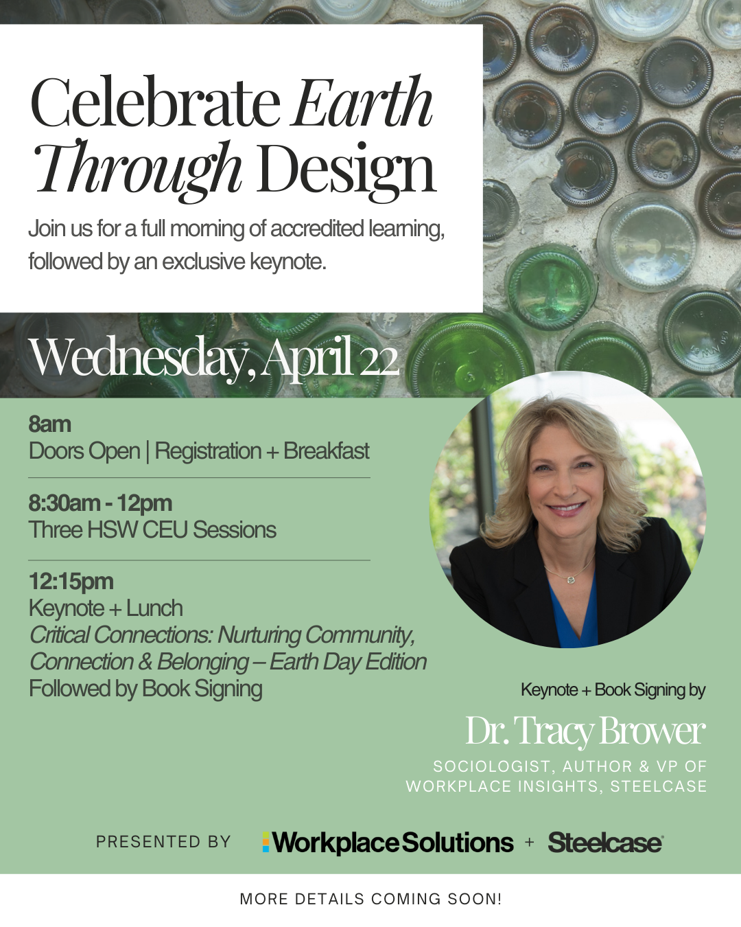 Join us for a morning of accredited learning, connection, and conversation in celebration of Earth Day. Attendees can earn up to 3 HSW CEU credits in one morning, followed by an exclusive keynote and book signing with Dr. Tracy Brower, sociologist, author, and Vice President of Workplace Insights at Steelcase.